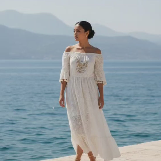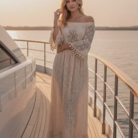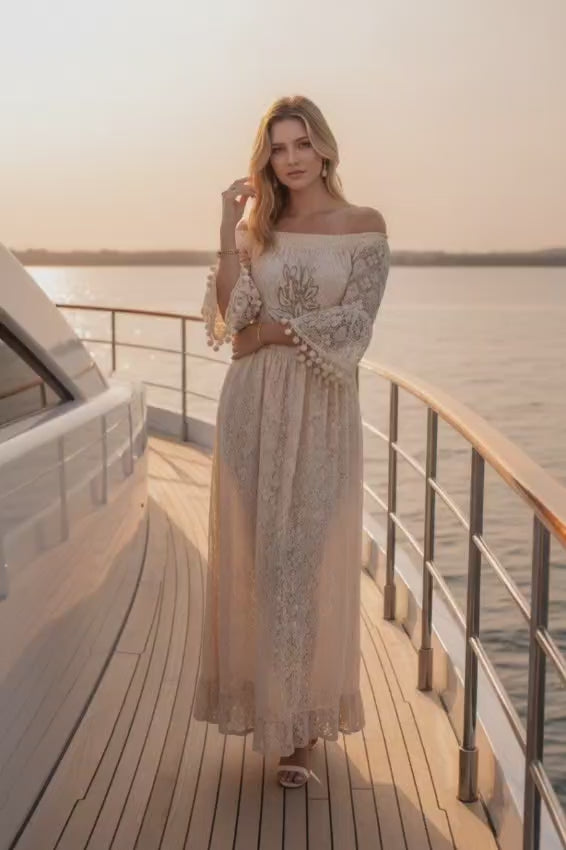 Romantic and effortlessly feminine, this cotton maxi dress is a must-have for spring and summer collections. Designed with an off-shoulder neckline, delicate lace fabric, and embroidered detail on the front, it offers a soft bohemian elegance perfect for festivals, holidays, and special occasions.
